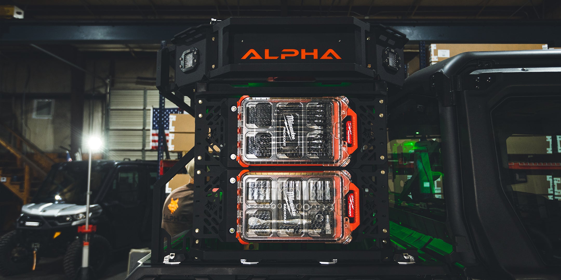 Modular mounting and organization accessory made specifically for Milwaukee Packout products. This Alpha Adapt accessory provides an effortless, secure, and waterproof gear transport mounting system while mounted directly to the Alpha Adapt UTV rack system. Compatible with both the Milwaukee Compact Wall Plate (48-22-8486) and Milwaukee Racking Shelf (48-22-8481). Mounted side-to-side, compatible with Milwaukee Mounting Plate (48-22-8485).