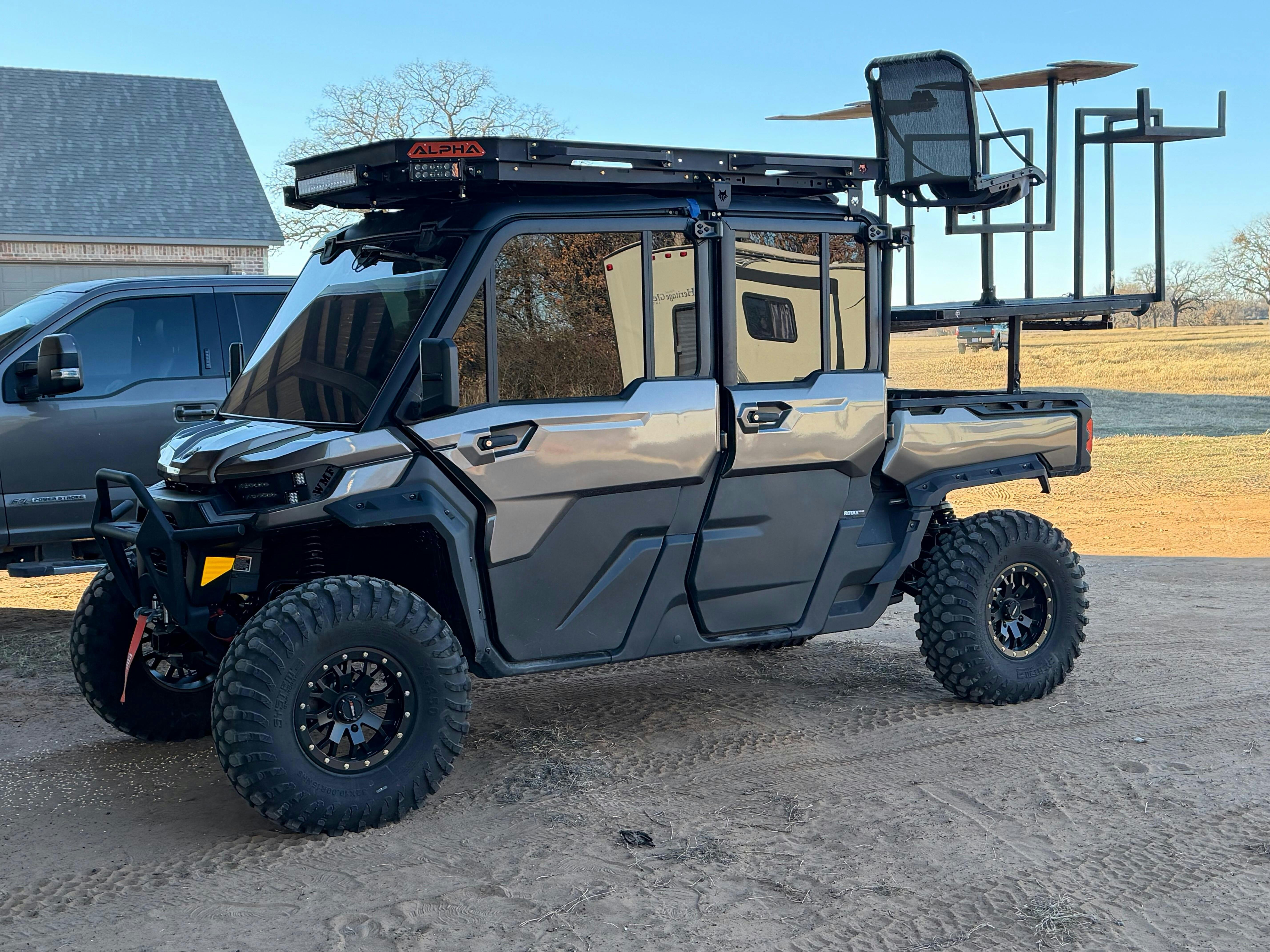 The Alpha Crew Cab Standard Roof Rack fits any Can-Am Defender, Polaris Ranger, CF Moto U-Force, or Kawasaki Mule crew cab model. It mounts directly to factory locations on your UTV. It is equipped with 9 optional locations to mount Millennium Tree stands M369 Revolution Chairs. It features a large 55 1/2" x 77 3/8" platform to sit and enjoy a predator hunt or stow all your gear with room to spare. An optional light package can be included to light up any nighttime activity.
